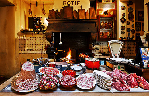 The first thing you will notice when entering La Tupina is the enormous hearth right next to the entrance, because it is large enough to walk right into it. Depending on the season, you may find a suckling pig or rack of lamb roasting on a spit there as if to inspire your menu choice. A huge wooden board in front of the hearth presents a buffet of diverse meats and sausage varieties along with brightly coloured regional produce. The scent emanating from this smorgasbord actually makes you want to stay and linger rather than taking your seat in the dining room.